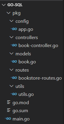 So to be short, the config folder will contain the configuration on how to connect with the database. The controllers folder will be have the function that handle the user request, updating the model, and return the result to the user to be viewed. The models folder will contain the object structure of the book, declaring the method that will update or manipulate the data on the model or object. The routes folder will contain the router using gorilla mux, and connecting it to the function on the controller.